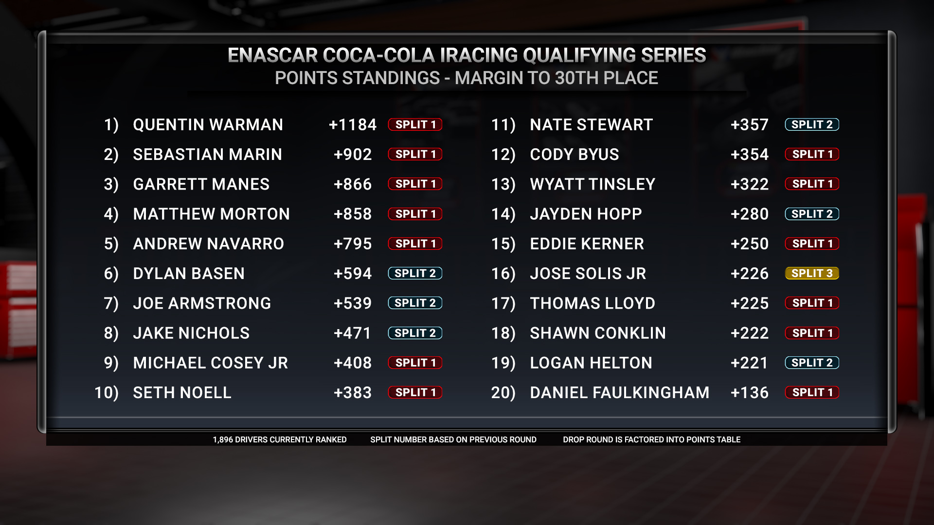 With the season-long standings concluding, while the focus will be on Top Split, there will be eyes across other splits to tune in to other top-30 hopefuls. Coverage from virtual Texas begins at 8 p.m. ET at eNASCAR.com/live and across iRacing social media channels. Tune in 15 minutes earlier to catch the Countdown to Green at 7:45 p.m. ET.