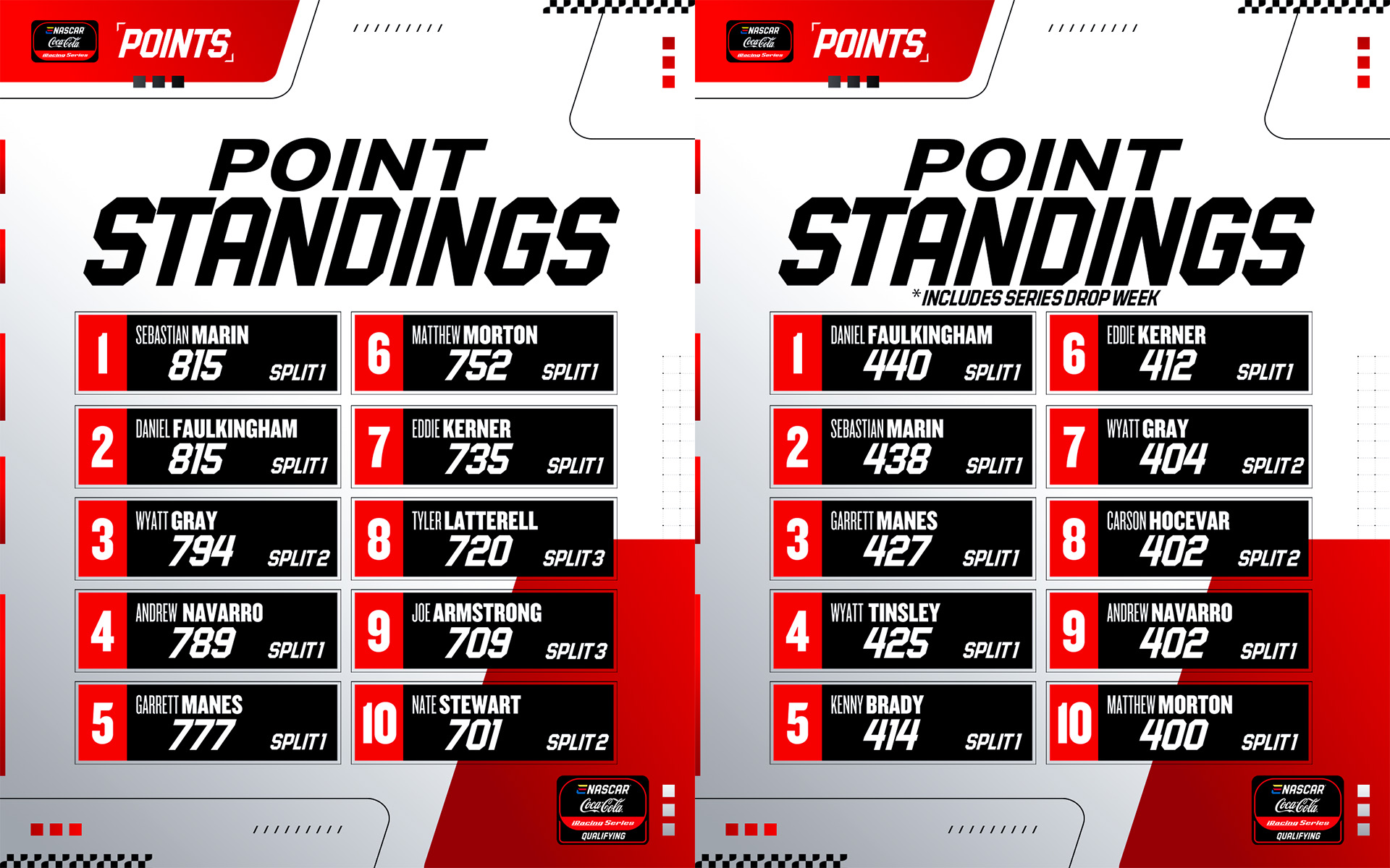 A unique part of the 2026 eNASCAR Coca-Cola iRacing Qualifying Series season is the inclusion of a drop week during the 11-race section of the season. If a driver participates in all 11 of the races, their lowest point total will be dropped from their total. If a driver misses a race at any point, they will use that missed race as their drop instead. A driver’s best 10 results, whether they ran all the races or not, will be scored for their final point total at the end of the season.