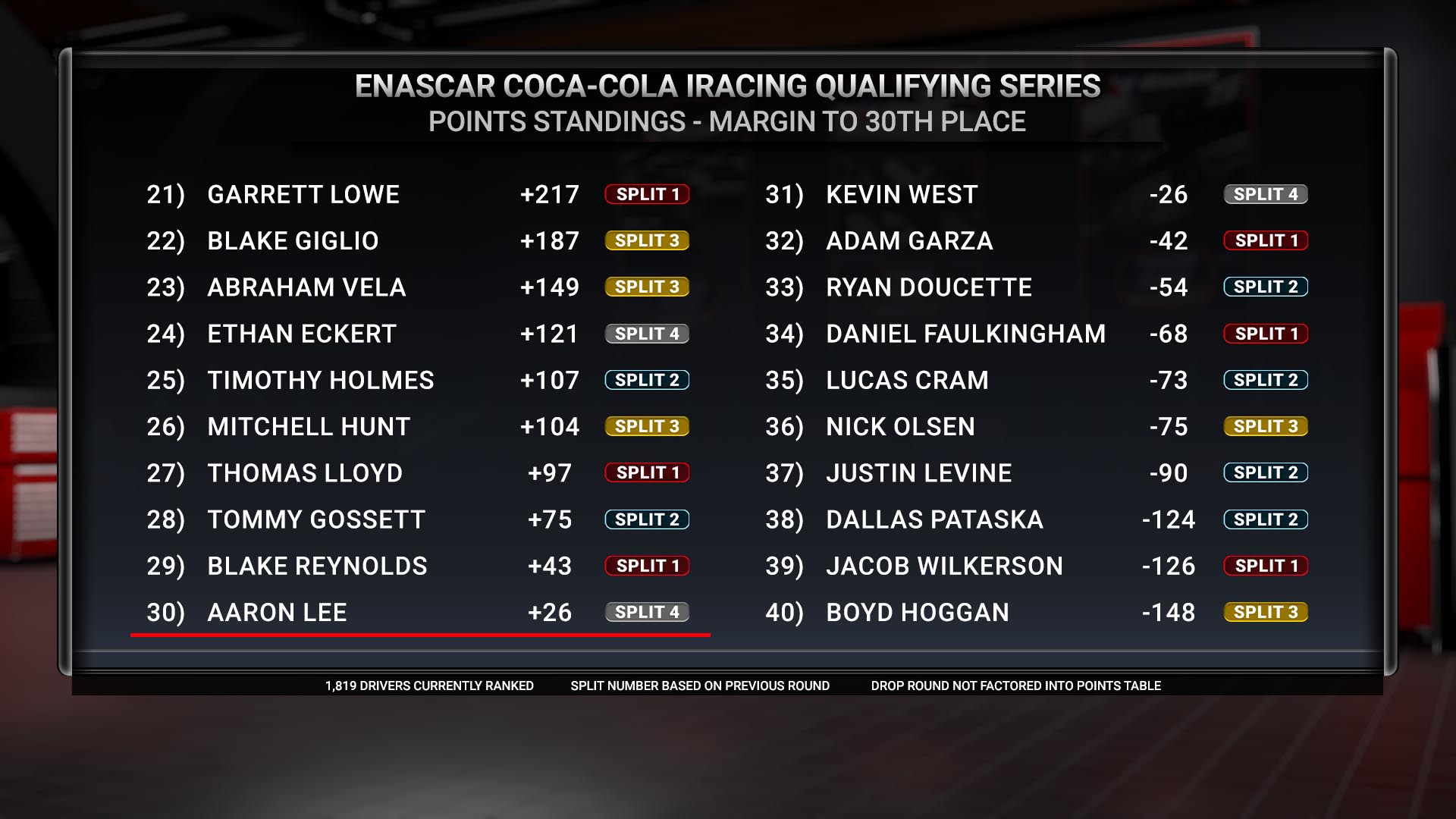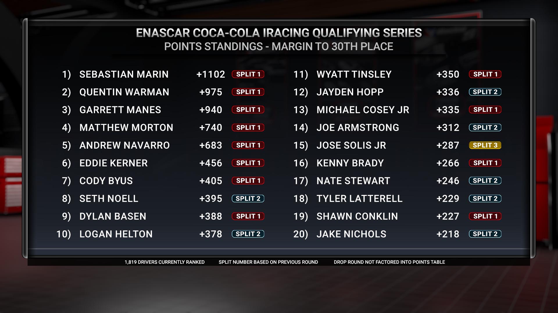 As we get closer to the final race, the cut line becomes more of the focus. Drivers like Marin, Manes, and Quentin Warman are basically going to be in the top-30 as long as they keep showing up. Starting after this race, the points will be reflected including a drop week.