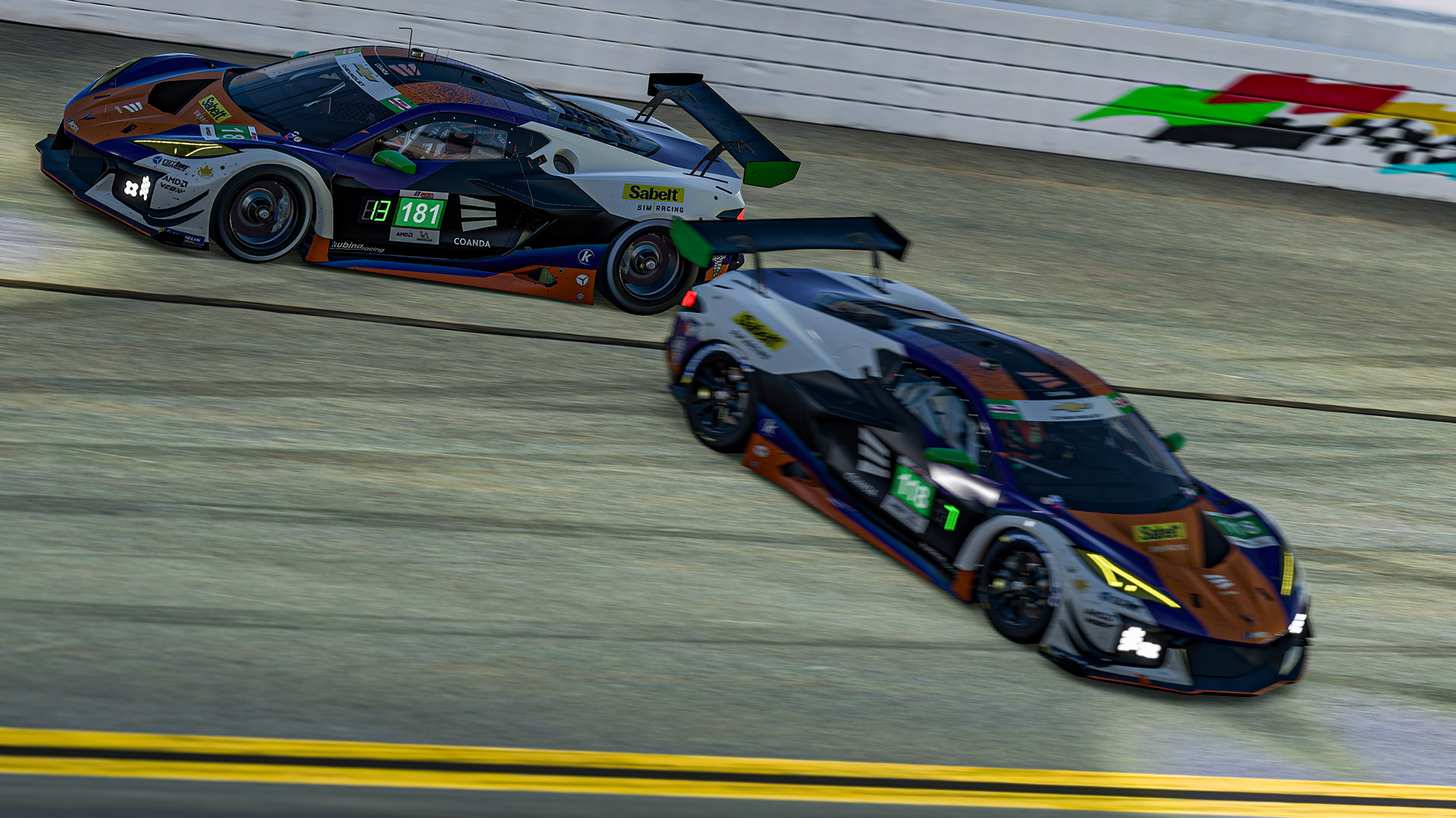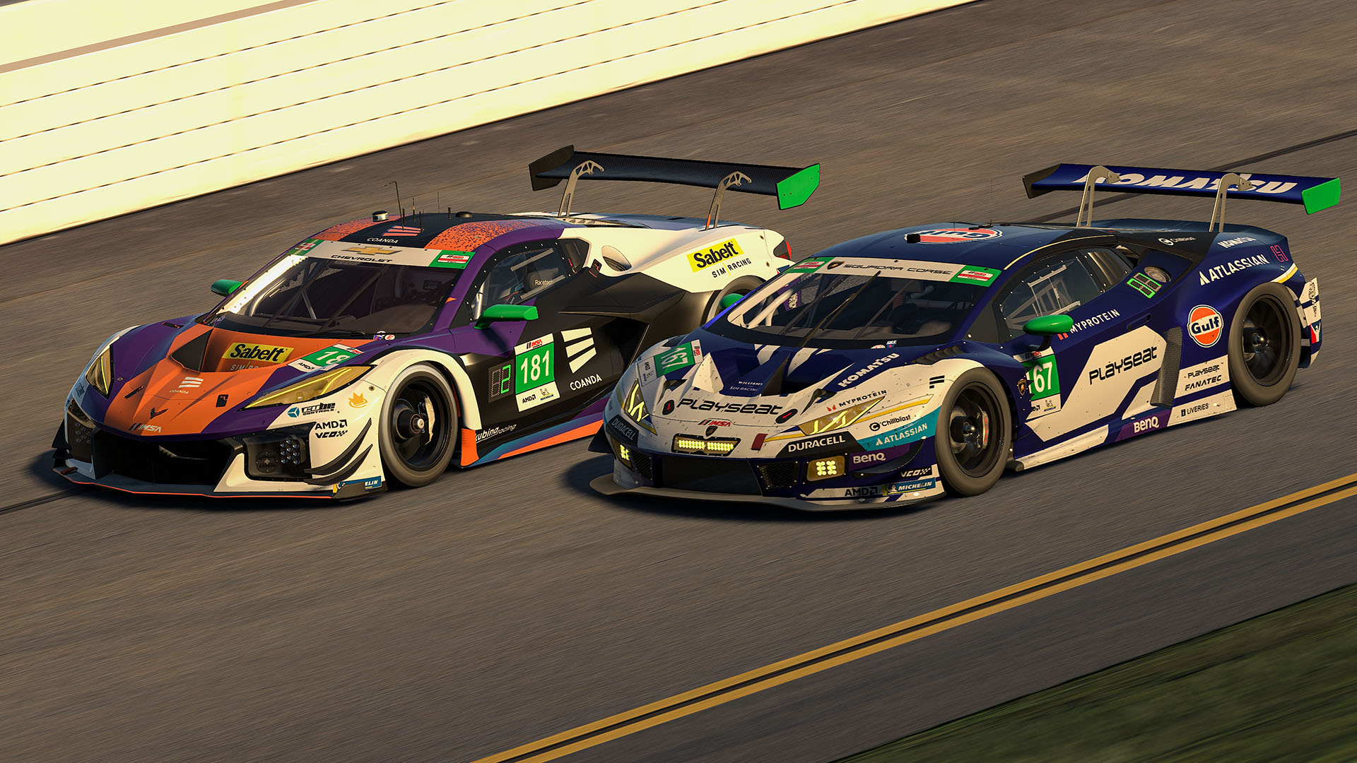 Iglesias, on cold tires, rejoined the race from pit road, still as the leader, but as the field exited the infield, the No. 118 lost control, and right in front of multiple GTD cars. Somehow, nobody hit the spinning Corvette, that group including the No. 181 of Sánchez. As the field redressed and reshuffled, the No. 118 was back down in seventh while the No. 181 regrouped in third. In the lead was the No. 167 Williams Sim Racing Playseat Lamborghini of Alessandro Bico and Beckham Jacir. Now up in second was the No. 199 Apex Racing Team Ford driven by Yohann Harth and Luca Kita.
