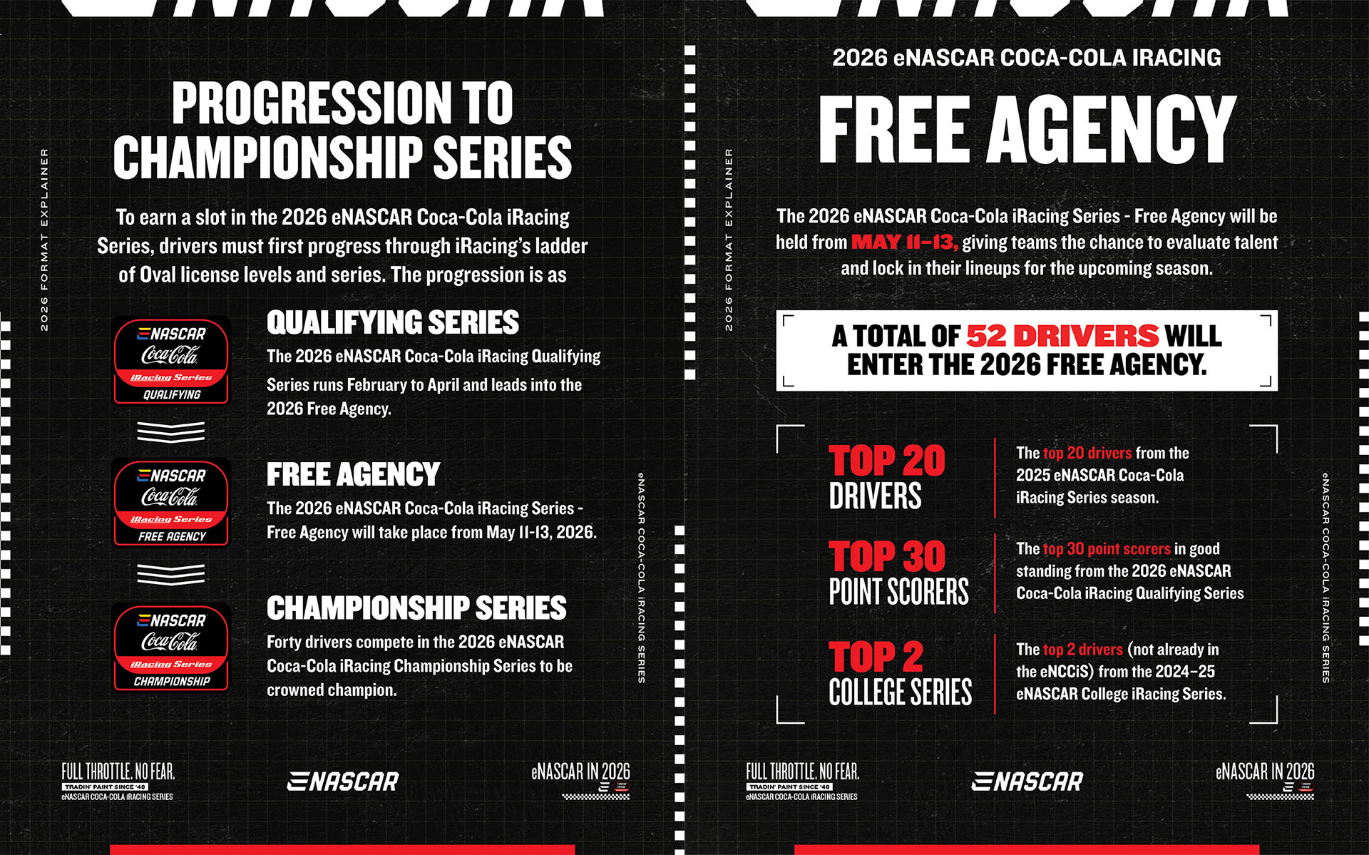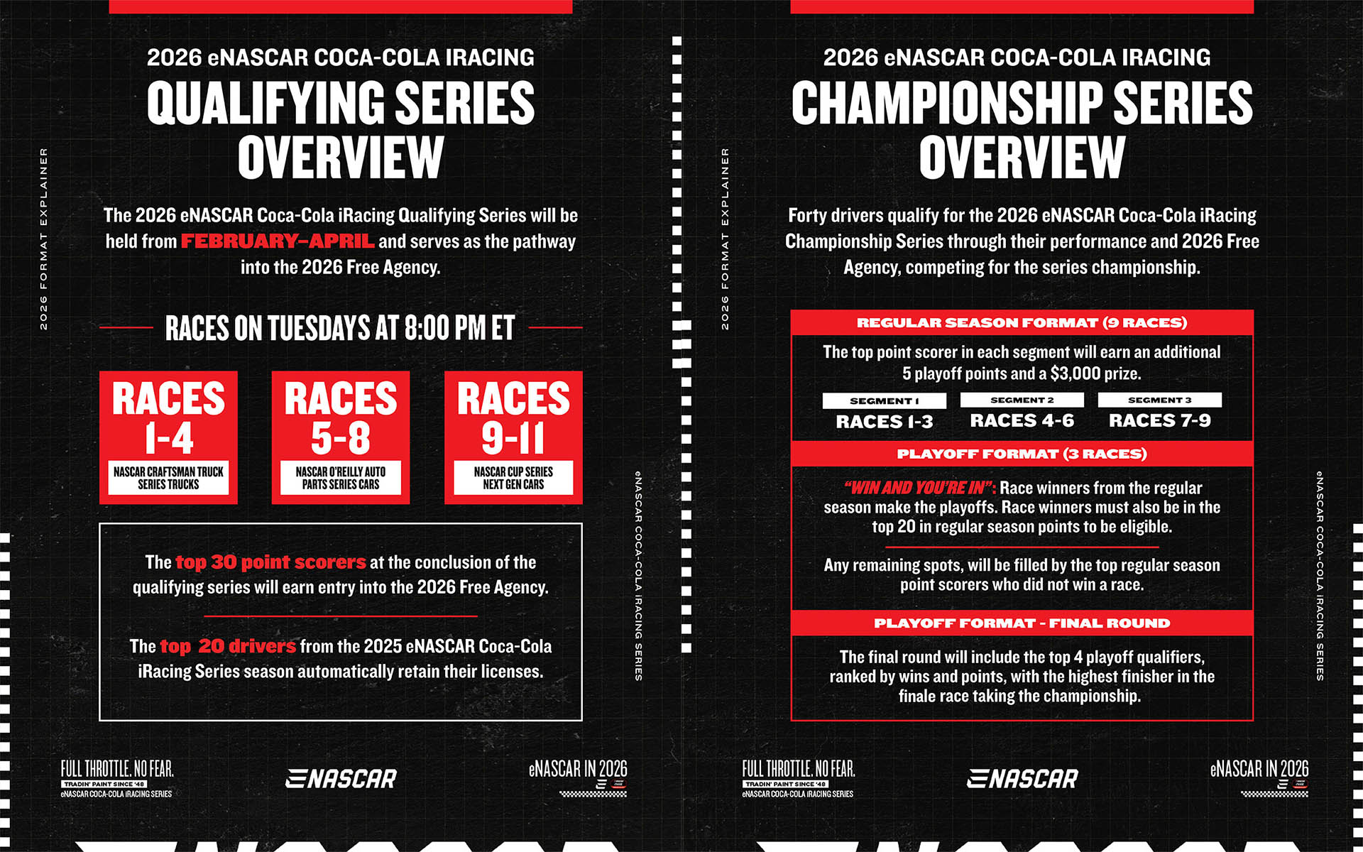 The eNASCAR Coca-Cola iRacing Series expands to a 24-race schedule in 2026, and the first 11 races will be as a part of the newly reconfigured eNASCAR Coca-Cola iRacing Qualifying Series from February to April. The remaining 13 races will be in the main eNASCAR Coca-Cola iRacing Championship Series, which starts in May.