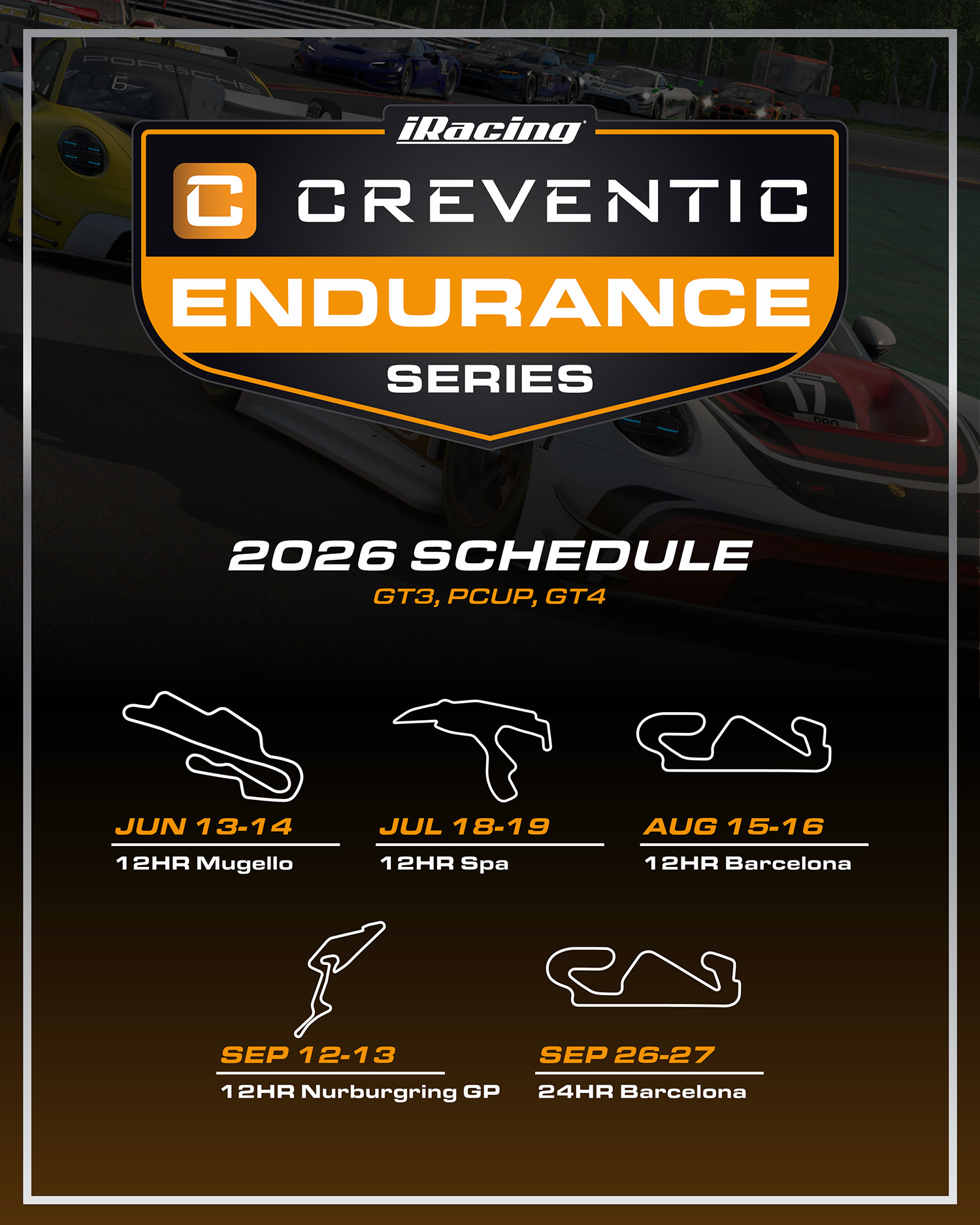 The iRacing Creventic Endurance Series returns for 2026, bringing another season of team-based endurance racing across a selection of world-class circuits.