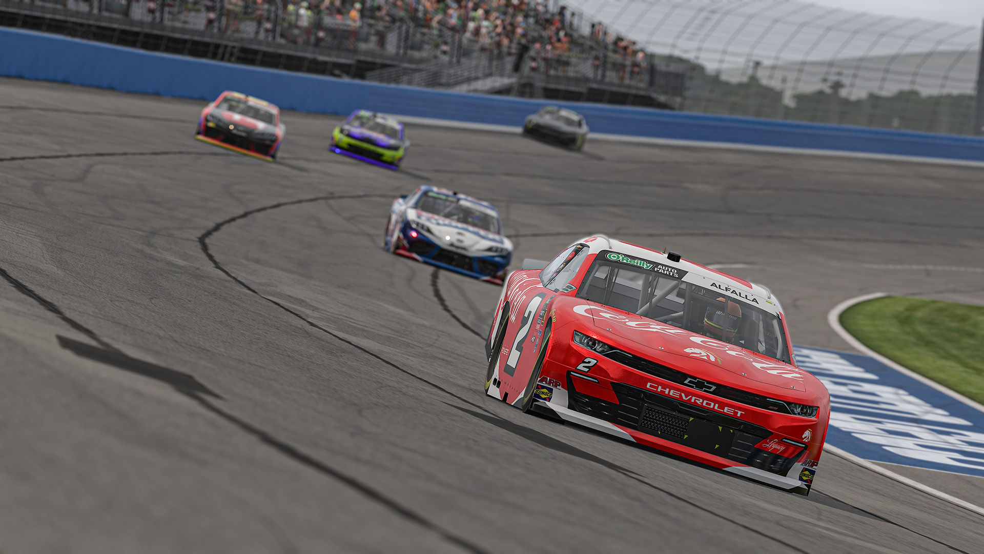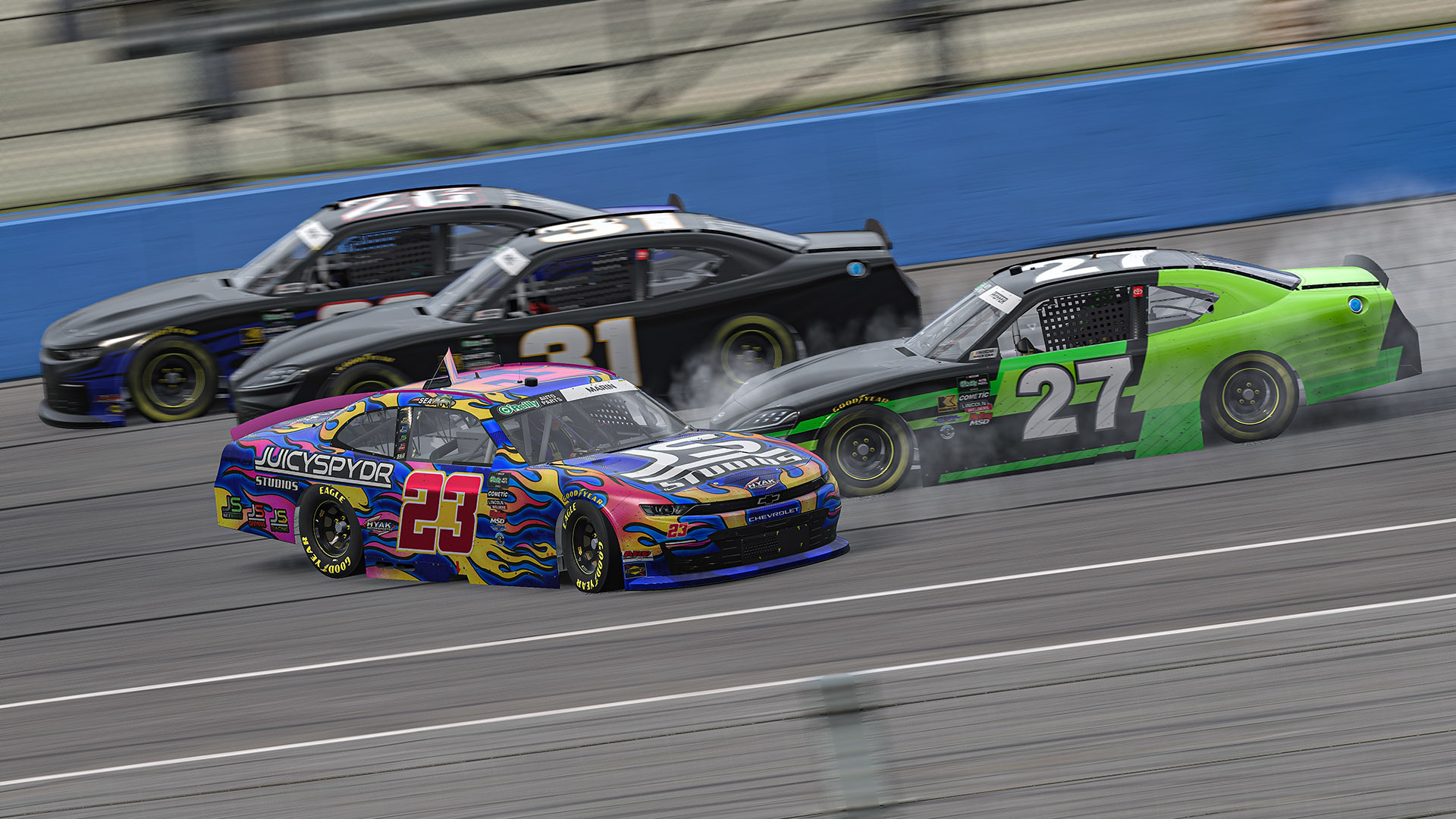 There were a couple of incidents in the first half, but none that the sim deemed caution worthy, despite one of the earlier ones sending cars spinning through the ball field. Those wrecks were off the racing surface, and while drivers like Garrett Manes and Quami Scott were forced onto a backfoot, their cars were still raceable and able to compete should a caution fly.